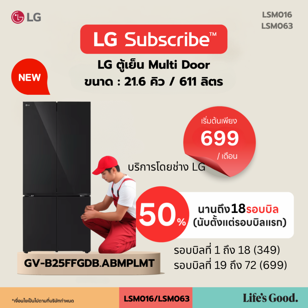 LG ตู้เย็น Multi‑Door GV‑B25FFGDB.ABMPLMT (ตู้เย็น 4 ประตู ความจุ ~21.6 คิว สำหรับครอบครัวขนาดกลาง-ใหญ่):