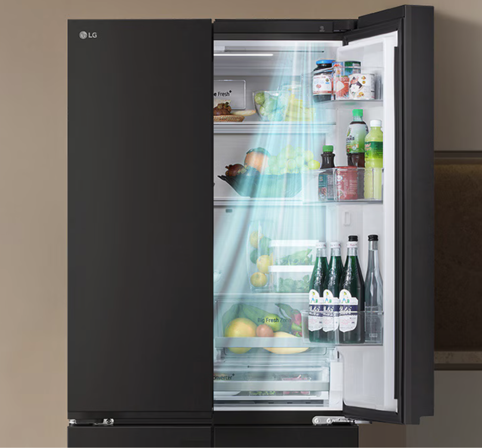 •ระบบ Door Cooling+™ ส่งลมเย็นที่ด้านหน้าช่องแช่ ทำให้เย็นเร็วและสม่ำเสมอทั่วทั้งตู้ ช่วยเก็บอาหารสดให้คงความสดได้นานขึ้น
