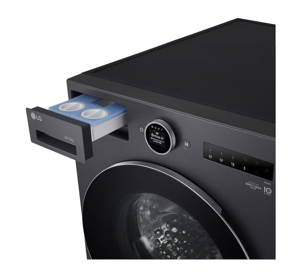 ความจุสูง: ซัก 20 กก. / อบ 10 กก. รองรับครอบครัวขนาดใหญ่ / ผ้าห่ม / ผ้านวม ได้ในชุดเดียว ลดจำนวนรอบซัก — เหมาะกับบ้านที่มีปริมาณซักเยอะ