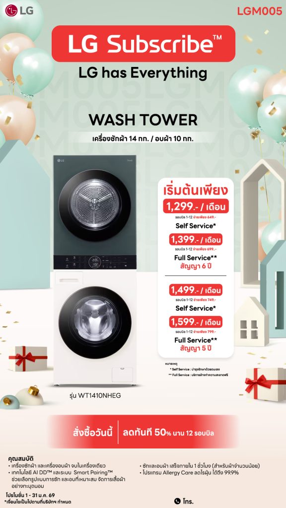 •ดีไซน์แนวตั้งแบบ “WashTower™” รวมเครื่องซักผ้า (ด้านล่าง) และอบผ้า (ด้านบน) เป็นหนึ่งเดียว
